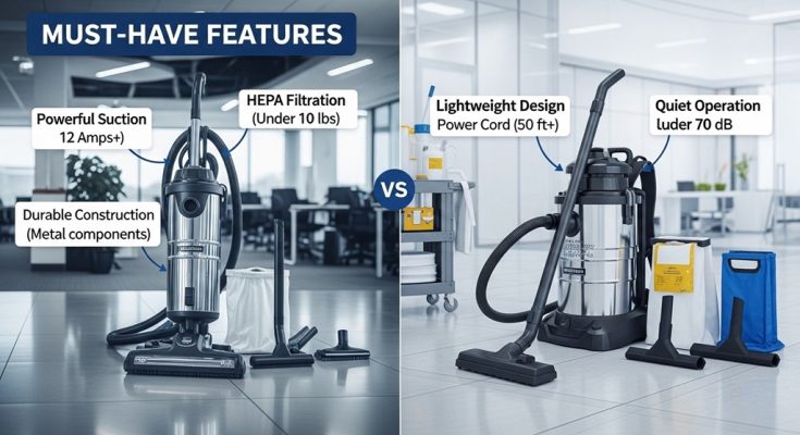 The most important features in commercial office vacuum cleaners include HEPA filtration, powerful suction, durability, noise control, ergonomic design, large capacity, and advanced filtration systems that support professional cleaning tools.
