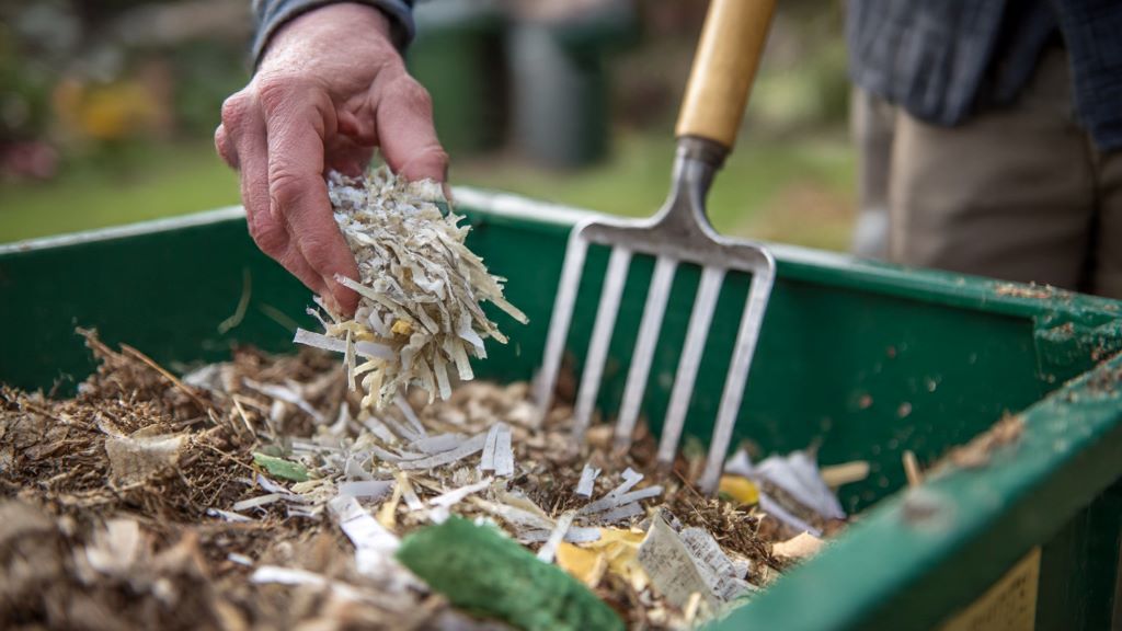 Person adding shredded paper to outdoor compost bin with garden fork and green waste materials visible